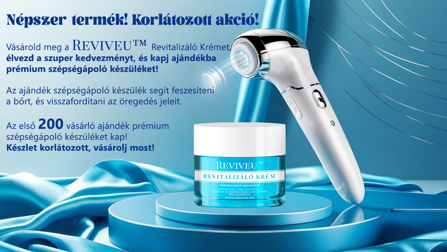 Válassza a Reviveu™ Revitalizáló Krémet, és engedje meg, hogy a kígyóméreg peptid ereje csodát tegyen a bőrével – mindössze 7 nap alatt! Ez a különleges, intenzív anti-aging kezelés gyorsan, de kíméletesen regenerálja és nyugtatja bőrét, visszaadva annak fiatalos, sima megjelenését. A Reviveu™ segít eltüntetni a finom vonalakat, feszesíti a bőrt, és hatékonyan kezeli a pigmentfoltokat, pattanásokat és ekcémát is. Ne hagyja ki ezt az egyedülálló lehetőséget – egy hét múlva bőre frissebb, ragyogóbb és magabiztosabb lesz, mint valaha! Vásároljon most, és élvezze a valódi változást!